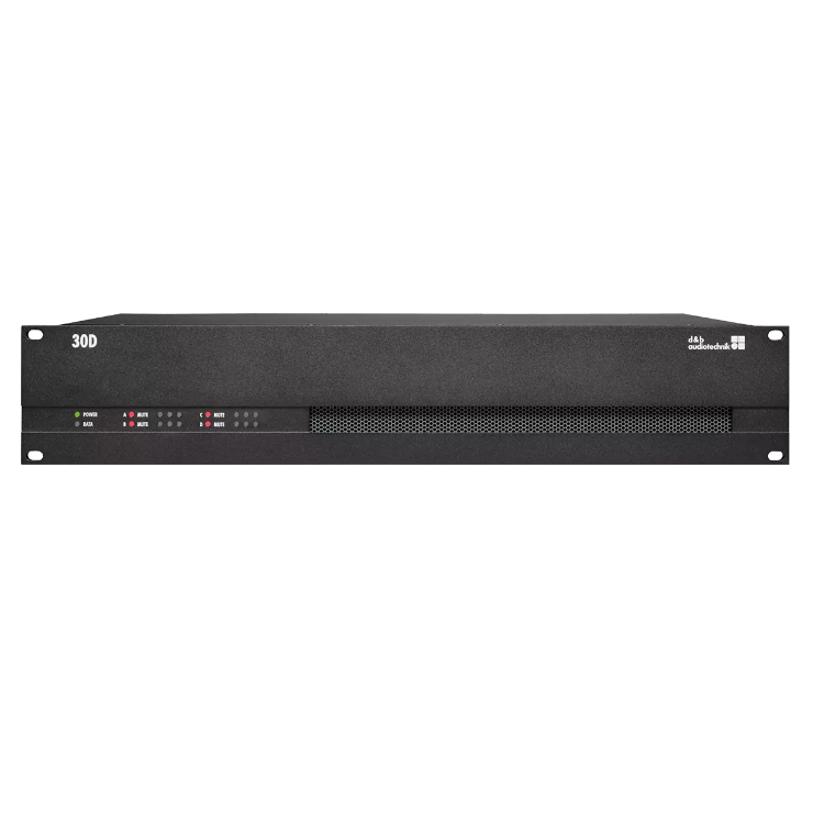 这款 2RU 高度的 30D 四通道数字功放,是专门为永久性固定安装且仅需要中高声压级的应用场所而设计的。该设备包含了扩展的输入管理功能,包括对每个输入通道进行独立的输入增益控制、通用输入/输出接口(GPIO)和一个一般故障报错报错接口。具有增强的系统状态监测功能,例如输入和负载监测功能,以确保在紧急情况下的适用性。30D 采用与最新一代 d&b 四通道数字功放相同的数字信号处理平台,为 d&b 较小型音箱提供音箱参数配置以及线性输出模式。30D 中集成的 DSP 提供了全面的音箱管理,包含可切换滤波功能以及用户自定义均衡和延时功能。这包括两个 16-段均衡器,并提供可选的参量均衡(PEQ)、非对称均衡(asymmetric)、搁架式均衡(shelving)或陷波(notch)滤波,而信号延时可设置高达 10 秒(=3440m/11286英尺),所有这些功能都可以独立应用于每个功放通道。30D 可通过 d&b 远程监控网络进行访问,可使用开放式控制架构协议(OCA)经由以太网进行访问,或通过使用 RJ45 接口的 CAN-BUS 访问。30D 可通过集成的 web 界面进行控制,该界面可通过浏览器访问,或使用 d&b R1 远程监控软件控制。该设备本身带有用于显示电源、输入、数据和静音状态的 LED 指示灯。30D 数字功放集成的负载匹配(LoadMatch)功能可对所用音箱线缆的特性进行电气补偿。30D 数字功放采用 D 类放大器,并采用具有有源功率因数校正(PFC)的电源,该电源适用于 100V/127V,50 – 60Hz 和 208V/240V,50 - 60 Hz 的电源电压,在电源功率不足或不稳定的情况下仍能保持稳定输出。输入和输出连接接口均为欧式接线端子(Euroblock)。