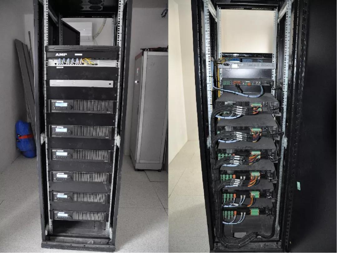 系统共计1个主控机房,4个功放室。各功放机房到主控机房完全光纤传输,摒弃了笨重而昂贵的模拟布线,实现简单、轻量且经济的解决方案。